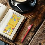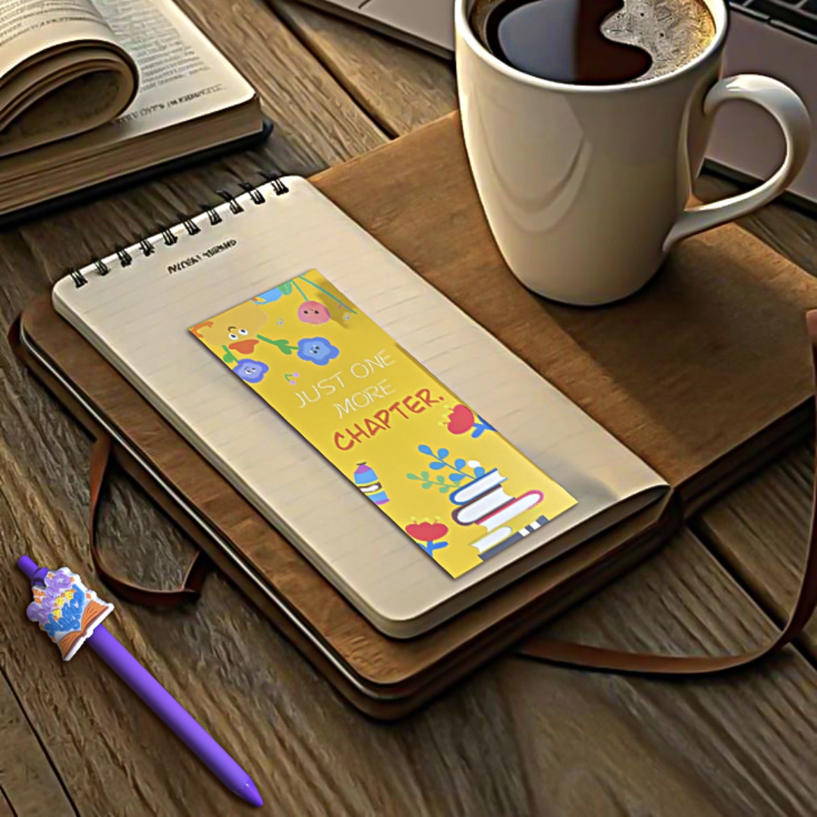 This Bright Floral Bookmark & Pen Set celebrates the timeless reading ritual of “just one more chapter” before lights out. Featuring playful hand-drawn flowers in pink, blue, purple, and orange against a sunny yellow backdrop, this set radiates joyful, optimistic reading energy. With whimsical book stack illustrations and scattered blooms throughout, this design feels like a celebration of those moments when you simply can’t put your book down.