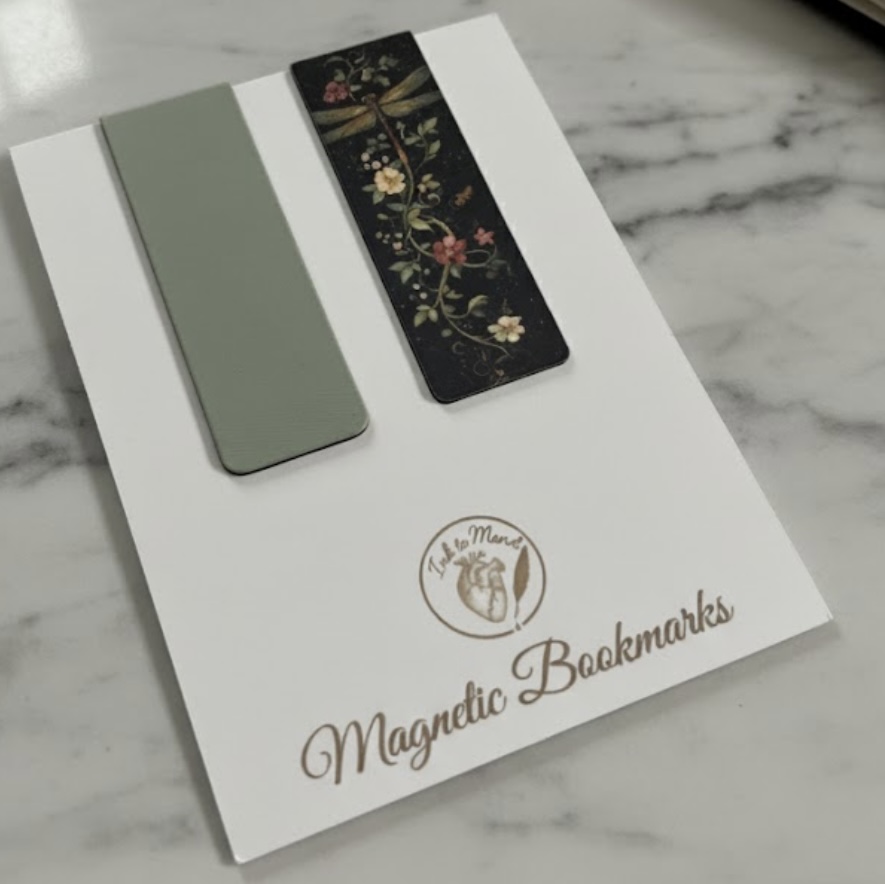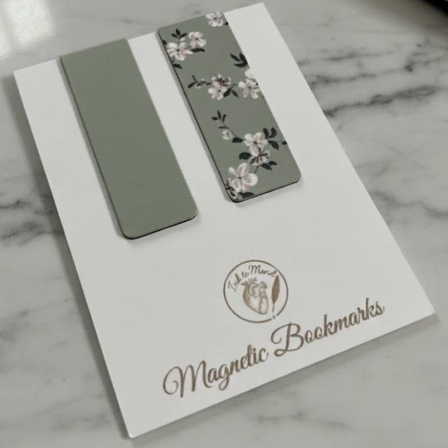 These Ink to Mend Magnetic Bookmark Sets are designed for readers who love earthy tones, botanical details, and a touch of bookish personality. Each set includes two coordinating bookmarks — one solid sage green bookmark and one illustrated design — thoughtfully paired to feel grounded, cozy, and visually balanced.