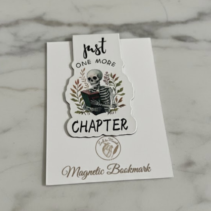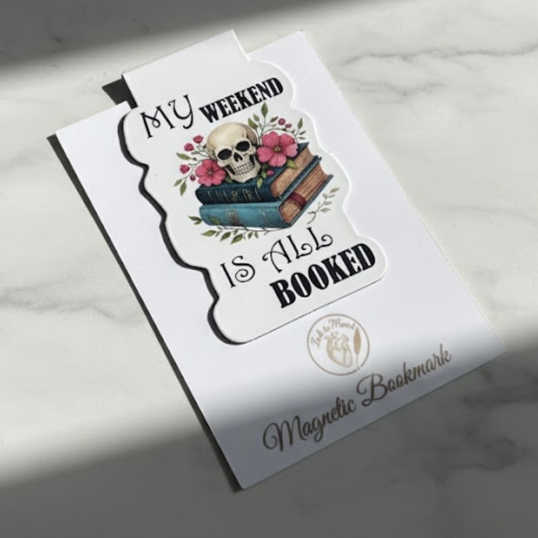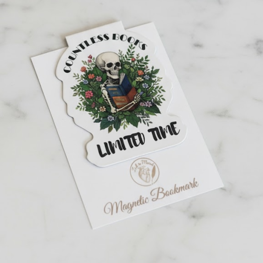 For readers who know the struggle of wanting more books than time allows, this magnetic bookmark collection blends dark whimsy, cozy bookish humor, and a love of stories that never quite ends. Each design features a charming skeleton reader motif paired with playful phrases — from weekend plans that are fully booked to the irresistible pull of “just one more chapter.”
