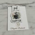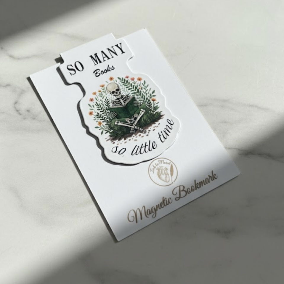 Crafted as a die-cut magnetic bookmark, each piece folds neatly over your page with soft yet strong magnets that hold securely without slipping, tearing, or creasing your book. The artwork balances slightly gothic elements with floral details and warm, inviting tones, making these bookmarks feel equal parts cozy and clever.