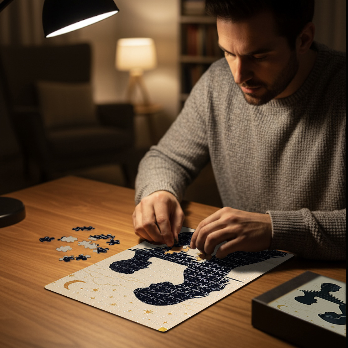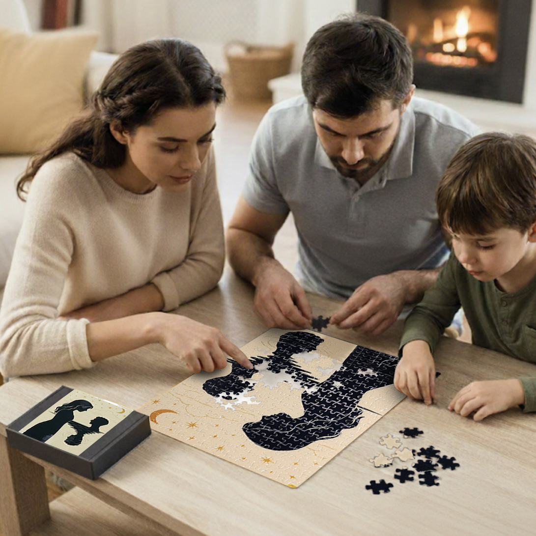 Every piece you place becomes a small act of mindfulness — a moment to slow down, breathe deeper, and reflect on the bonds that ground you. The contrast of deep navy silhouettes against a soft, starlit background creates an emotional, frame-worthy image that tells a story of trust, presence, and the quiet strength found in showing up for the people who matter most.