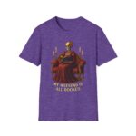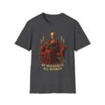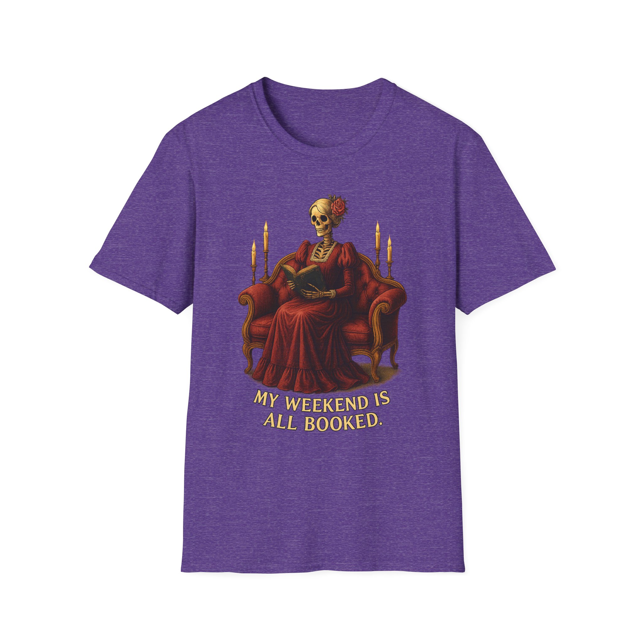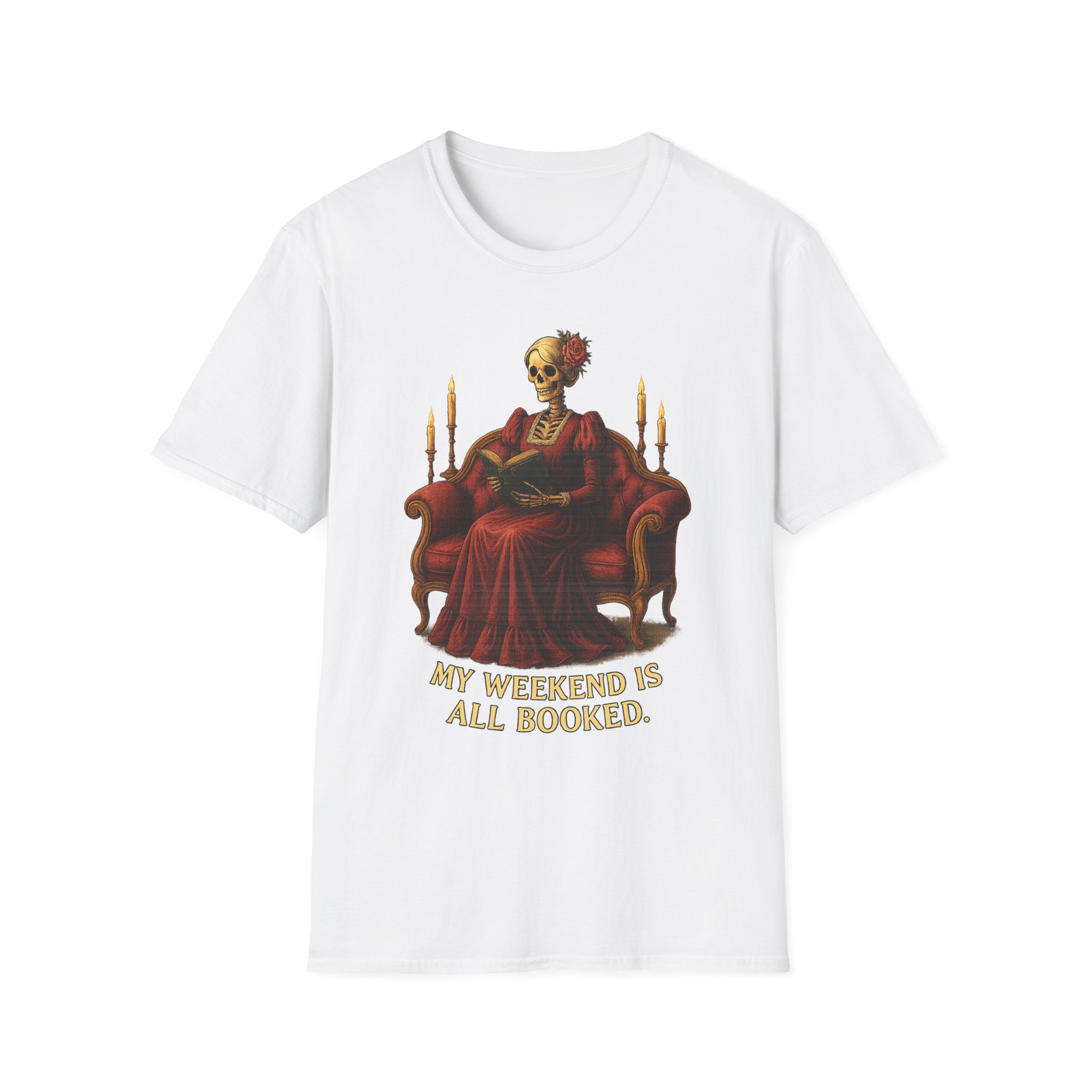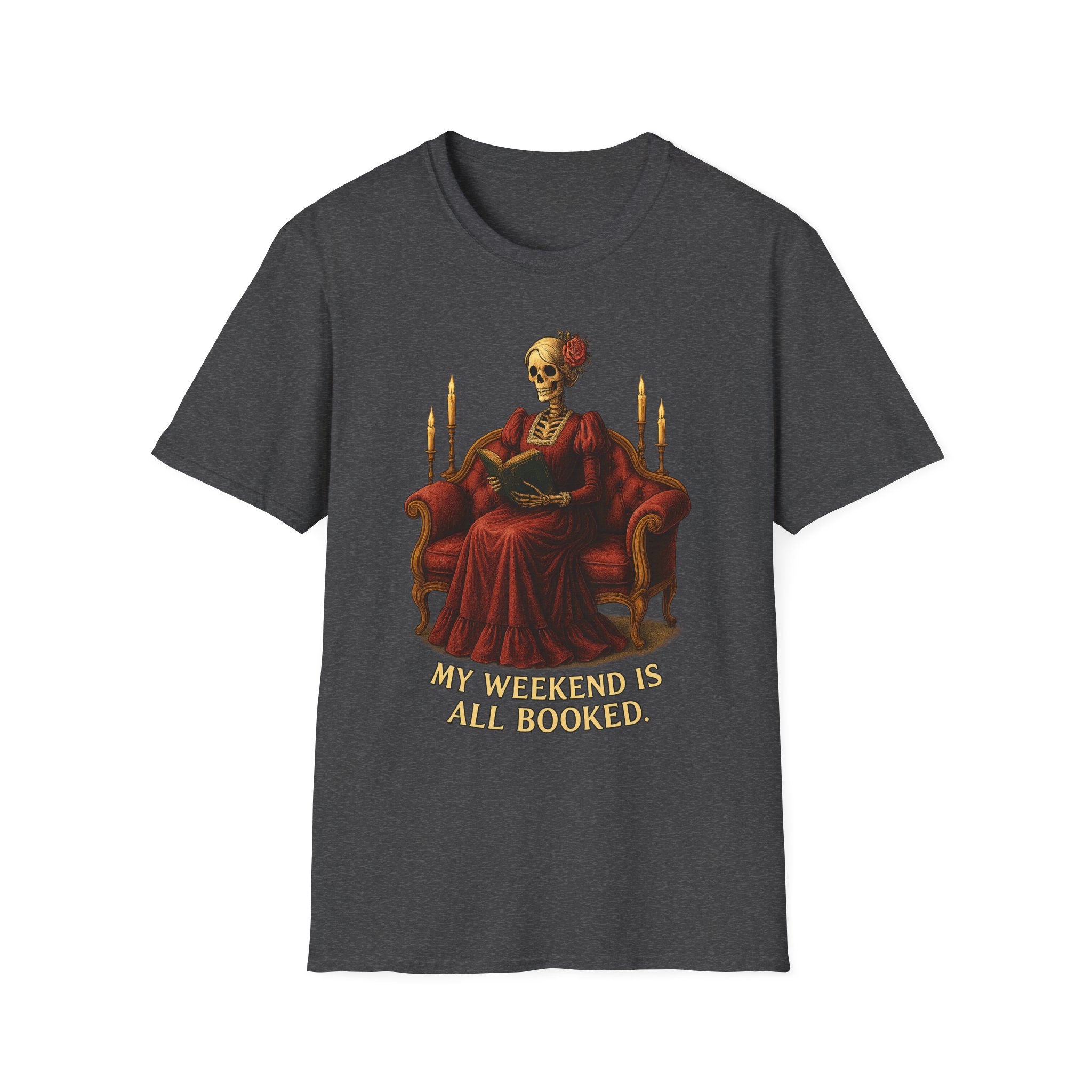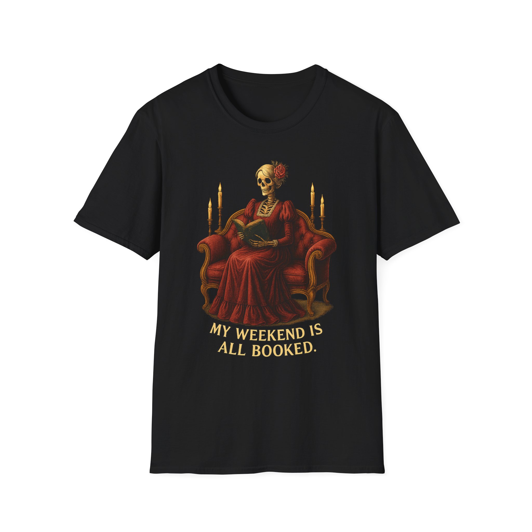 Our “My Weekend Is All Booked” T-shirt combines spooky vibes with timeless bookish charm. Featuring a skeleton elegantly dressed in a flowing red gown, reading by candlelight on a vintage sofa, this design is perfect for literature lovers who embrace both the eerie and the refined.