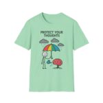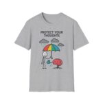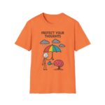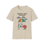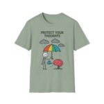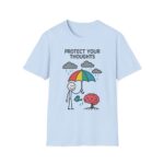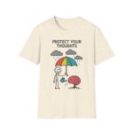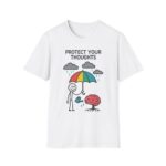 Our “Protect Your Thoughts” unisex softstyle t-shirt gently reminds us to guard our mental space. With a stick figure shielding a growing brain beneath a rainbow umbrella while watering it with care. This design is as thoughtful as it is adorable.